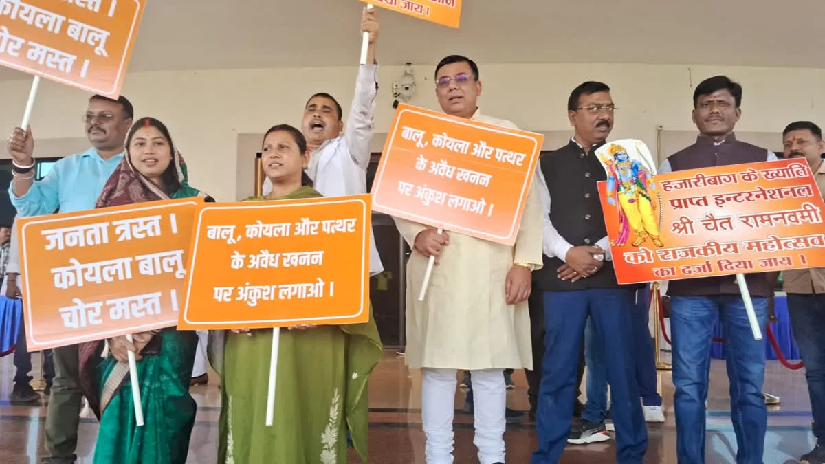 रांची: झारखंड विधानसभा के बजट सत्र के दौरान बुधवार को भारतीय जनता पार्टी (भाजपा) के विधायकों ने परिसर में जोर-शोर से ‘जय श्रीराम’ के नारे लगाए. यह प्रदर्शन हजारीबाग में मंगलवार को निकाले गए मंगला जुलूस के दौरान प्रशासन द्वारा डीजे जब्त किए जाने के विरोध में किया गया.